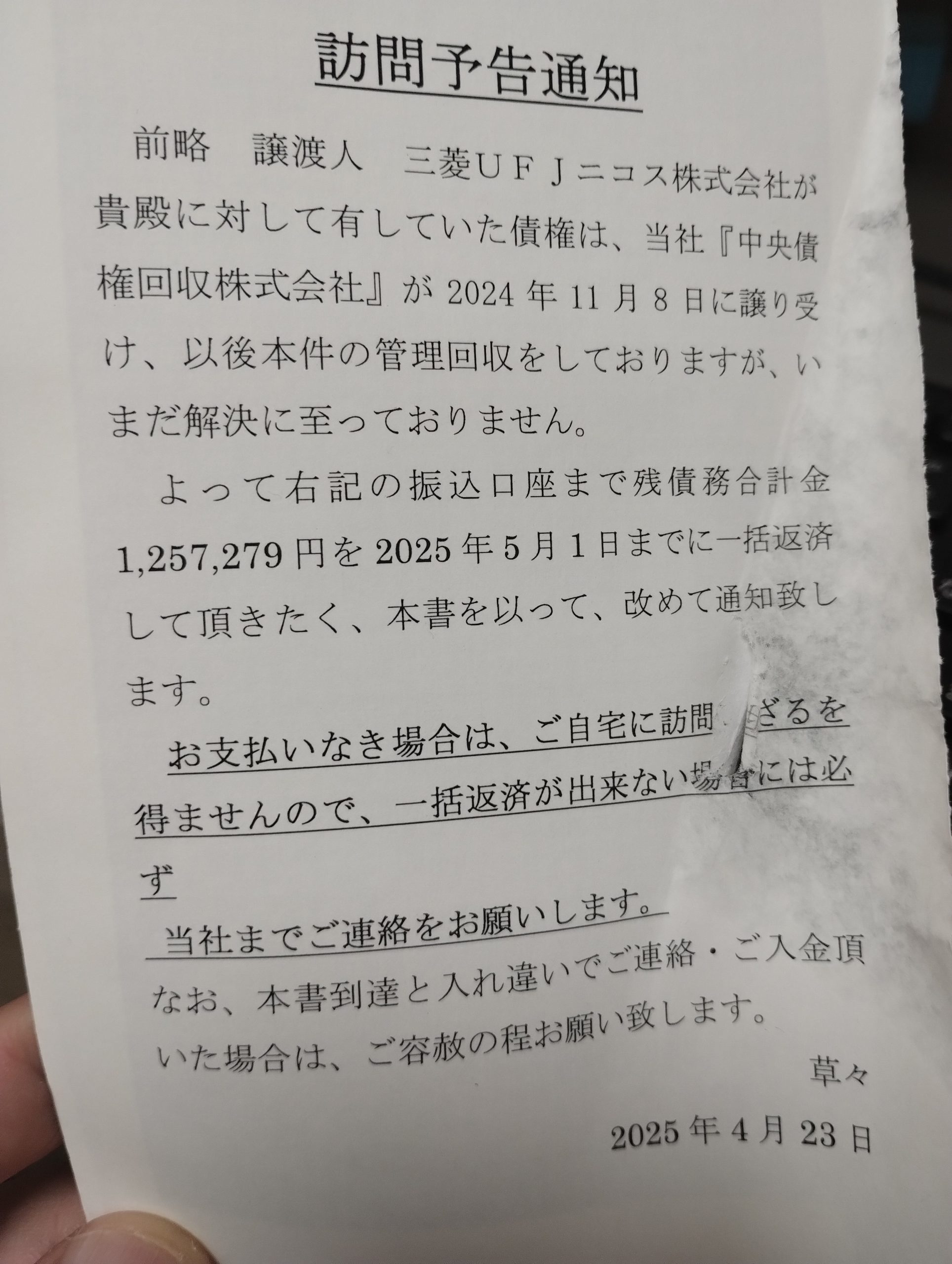 支払い滞納で中央債権回収から送られてきた訪問予告通知